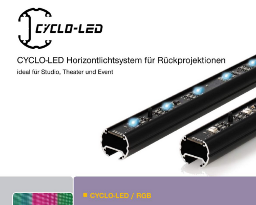 Mit dem CYCLO-LED System wird die farbige Hintergrundgestaltung noch flexibler. Durch die Anordnung von LEDs in einem engen Raster hinter einer Projektionsfolie können verschiedenste Grafiken, Laufschriften und sogar Videoinhalte großflächig wiedergegeben werden. Dabei reduziert sich der notwendige Abstand zur Projektionsfolie auf nur 20 cm.