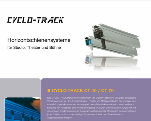 Mit dem CYCLO-TRACK System haben wir ein universell einsetzbares Vorhangschienen-System für Film- und Fernsehstudios, Theater und Mehrzweckhallen entwickelt, das sich überall dort perfekt einsetzen lässt, wo eine gleichermaßen effektive wie auch funktionelle Abhängung von Horizonten oder Vorhängen gefragt ist. Durch den modularen Aufbau mit individuell nach Kundenanforderung ausgeführten Systembestandteilen sind Schienenanlagen jeder Größe – bis hin zu mehrläufigen Systemen mit Weichen, Parkschienen und Absenkstationen – kostengünstig realisierbar.